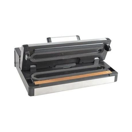L’appareil à emballer sous vide d’air semi-pro conditionne hermétiquement les aliments dans un film plastique sous vide d’air pour une meilleure conservation tout en préservant la saveur et la valeur nutritive des aliments. Simple d’utilisation, il fait le vide, soude et coupe le sac en une seule opération. Pratique, il effectue une double soudure pour assurer une meilleure étanchéité et propose un fonctionnement automatique ou manuel. Compact, son corps en inox brossé est muni d’une poignée de verrouillage du couvercle pour assurer l’étanchéité. Le manomètre permet de visualiser la dépression (max 0,9 bars) et le panneau de commande multifonctions avec touches sensitives tactiles : 3 niveaux de soudure, fonctionnement automatique, faire le vide manuellement, soudure manuelle.