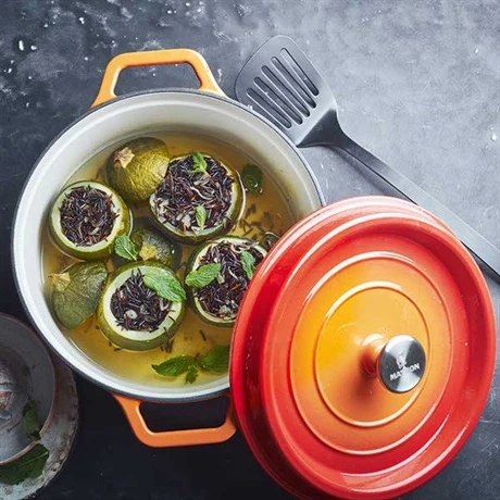 La cocotte en fonte d’acier émaillée ronde 28 cm orange Mathon de 5,6 L est un ustensile de cuisson indémodable car il permet une cuisson naturelle et traditionnelle. Polyvalente, la cocotte en fonte s’utilise pour cuire vos volailles, gigots et rôtis mais aussi pour du poisson ou pour tous types de plats mijotés. Vous pouvez également l’utiliser pour cuire du pain que vous confectionnez maison sans effort. Gonflé, doré et croustillant à souhait, le pain obtenu est délicieux.