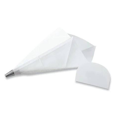 Le kit comprend une corne de pâtissier en polypropylène 12 cm x 7,5 cm, cinq poches à douille jetables en papier siliconé de longueur 28 cm et une douille lisse en inox.