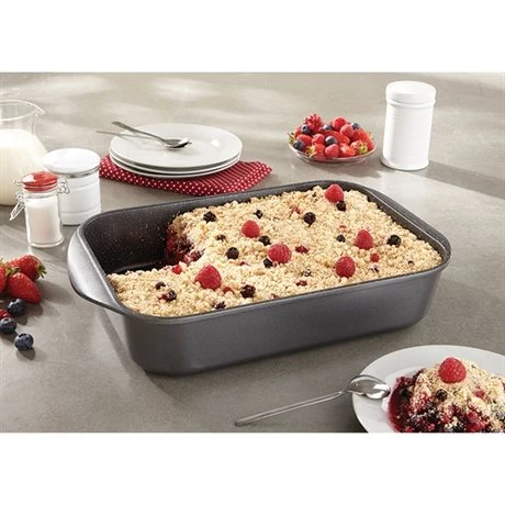 Ce plat à four fait partie de la gamme Dur comme la pierre composée de casseroles, poêles antiadhérentes, sauteuses antiadhérentes avec couvercle, poêle à poisson, cocottes, crêpière, wok et faitouts.