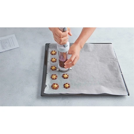 Gourmands, gourmandes, vous allez aimer la Presse à biscuits deux couleurs Betty Bossi pour confectionner des biscuits remarquables et colorés en un clic. Elle convient pour les débutants volontaires jusqu’aux experts chefs pâtissiers. Avec 6 embouts à biscuits différents, il est possible de créer 6 formes différentes : étoile, fleur, trèfle, couronne, damier ou « S ». Une fois l’embout choisi et la pâte introduite dans l’appareil, c’est parti pour le dressage ! D’une seule main, il suffit d’un clic pour dresser un biscuit bicolore et parfait directement sur du papier cuisson. En bonus, vous recevez une compilation de recettes appétissantes et savoureuses.